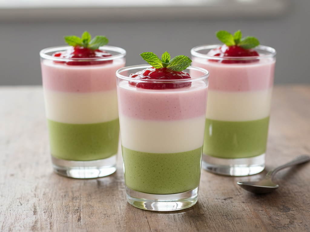 抹茶の緑、プレーンの白、苺のピンクが美しい三層仕立てのヨーグルトムース。