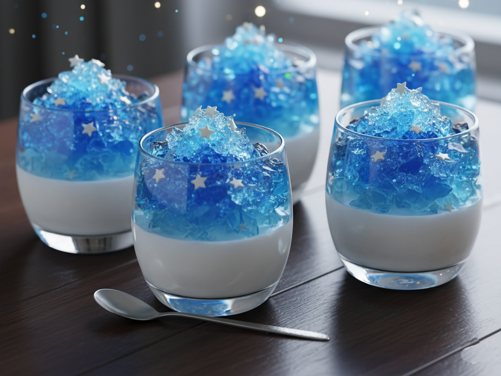 ミルクの白とブルーハワイ・ブルーキュラソーの青で、夜空に輝く天の川を表現した爽やかなクラッシュゼリー。