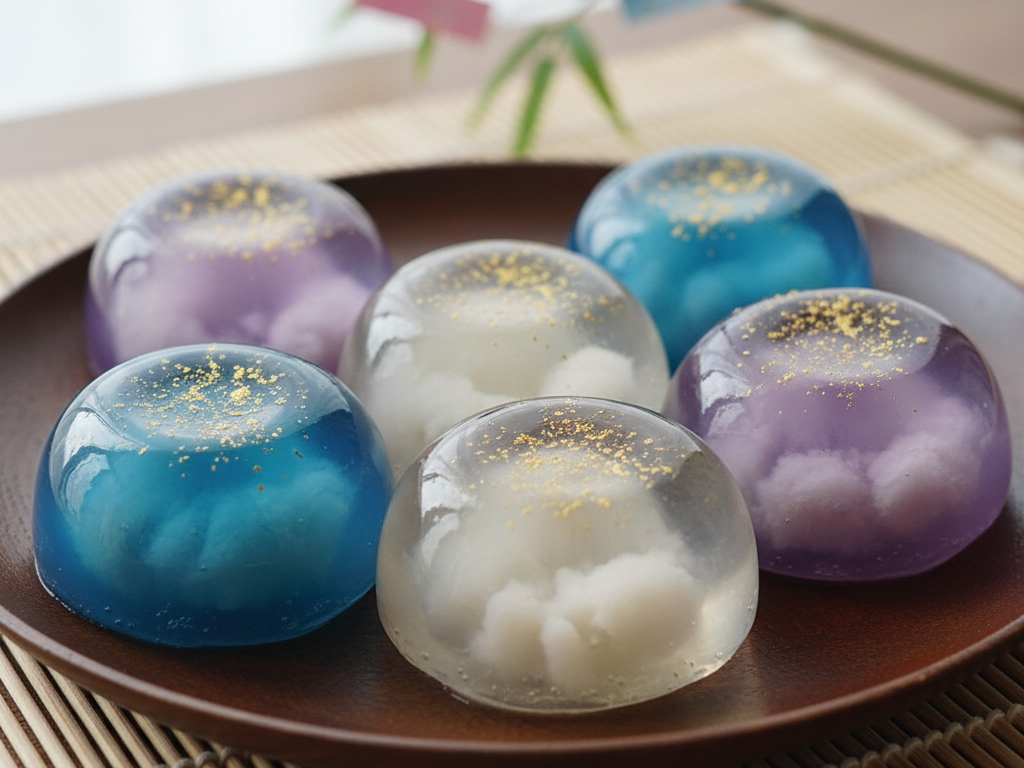 透明な水まんじゅうに、青や紫の着色で夜空と星を閉じ込めた、七夕にぴったりの和スイーツ。