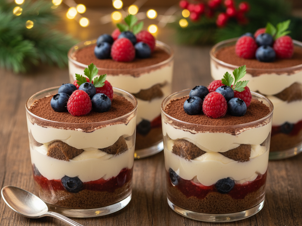 ココアスポンジと濃厚なチーズクリームを重ね、いちごジャムとたっぷりのベリーでデコレーションしたクリスマス仕様のティラミス。