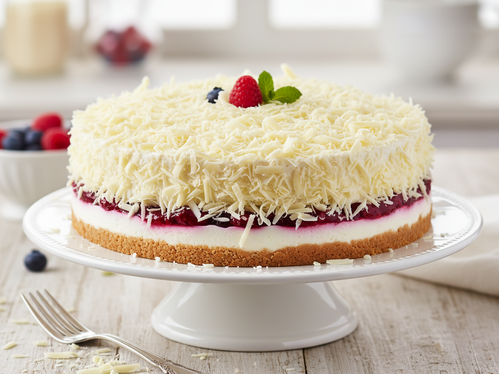 ベイクドチーズケーキの上に甘酸っぱいベリーソースを敷き、真っ白なチーズムースで覆った二層仕立てのケーキ。